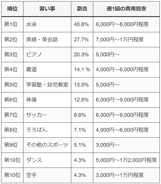 スポーツでは水泳、学習では英語(英会話)が人気となっています。子どものやりたいと思う習い事をさせたいという考えは第一だと思います。ですが、限られた時間・費用の中ではそれ以外の考えを持つことも間違いではないと思います。ここからは、筆者の個人的な考えとなりますが、、、