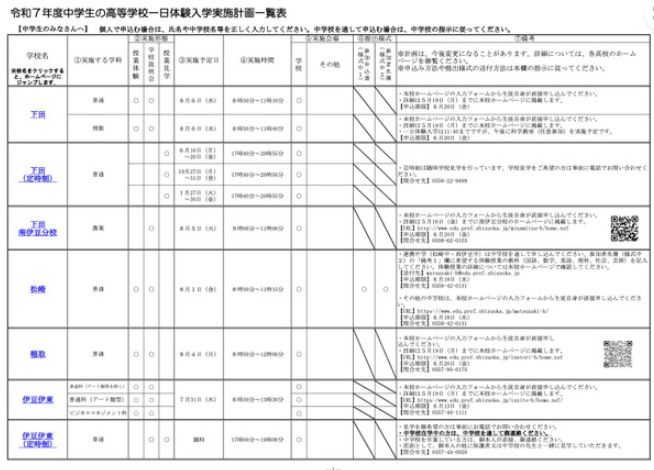 静岡県教育委員会は2025年5月13日、中学3年生を対象とした公立高校の1日体験入学の概要一覧をWebサイトに掲載した。浜松北が7月29日と11月1日、静岡が6月7日から10月25日まで計6回開催するなど、5月から12月にかけて多数実施される。
