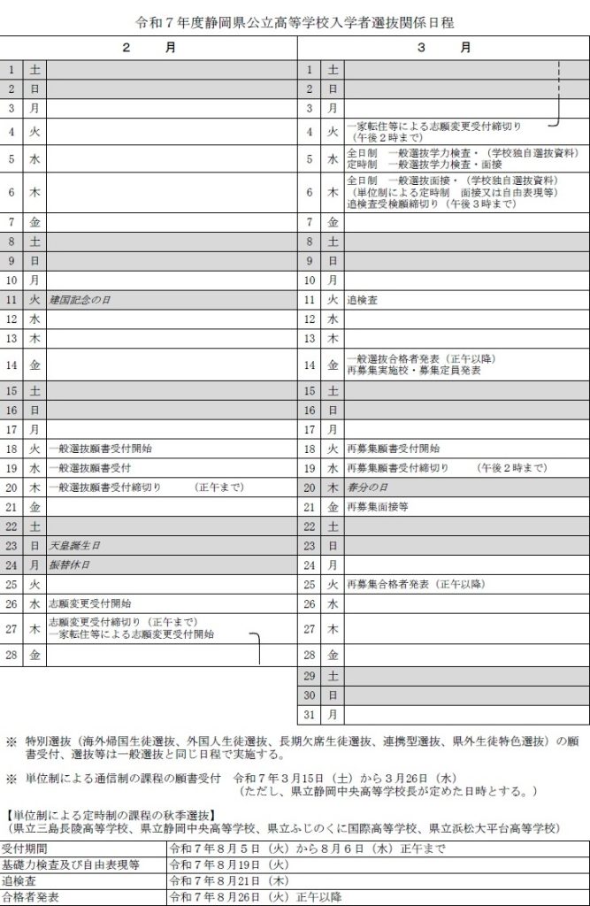 静岡県内の中学・高校・大学の願書受付や試験日程を、