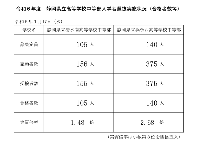 静岡県 令和6年度 静岡県立高等学校中等部 入試、合格者と倍率(清水南中等部、浜松西中等部)